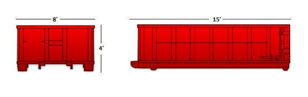 The dimensions for a 15-yard container are: 8 ft. x 4 ft. x 15 ft.