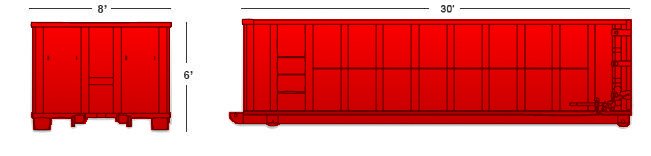 The dimensions for a 30-yard roll off dumpster are: 8 ft. x 6 ft. x 30 ft.