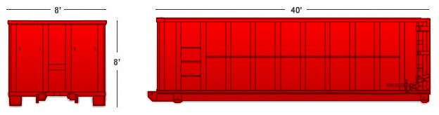 The dimensions for a 40 cubic yard roll off dumpster are: 8 ft. x 8 ft. x 40 ft.